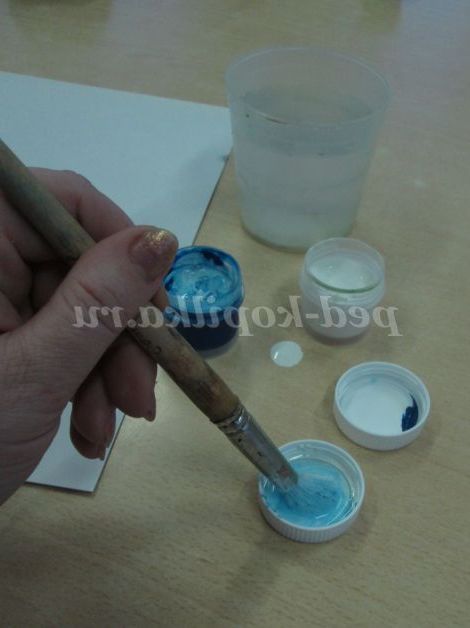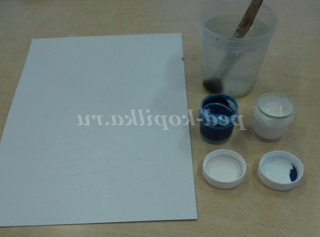 2. Тепер нам знадобитися гуаш білого і синього кольорів і стаканчик з водою, пензлик.