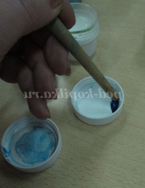 Змішуємо білу і синю гуаш у кришечці від гуаші до отримання ніжно блакитного відтінку.