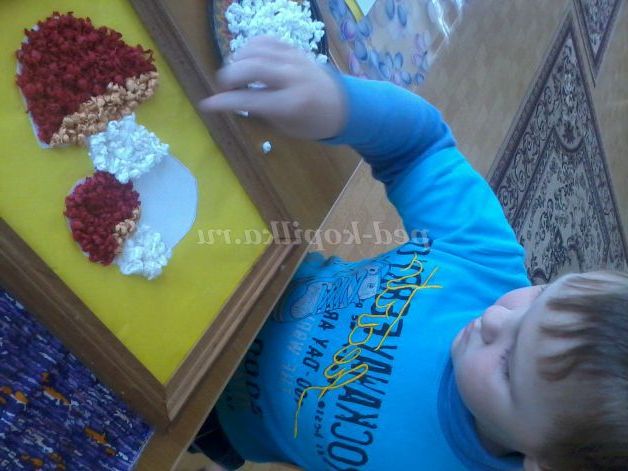 Потім змащуємо ніжки грибів клеєм, і посипаємо білими кульками.
