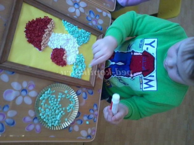 Гриби готові. Зображуємо зелений лужок. Намазуємо під грибами і навколо ніжок клеєм і посипаємо зеленими кульками.