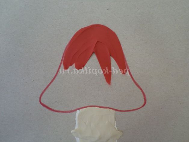 А тепер зробимо капелюшок. Відщипуємо шматочок червоного пластиліну, скачуємо кульку між долонями круговими рухами, вдавлюємо на основу у верхній частині капелюшки.