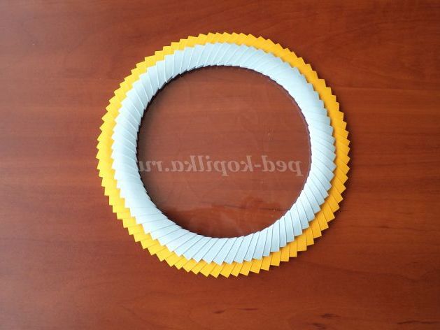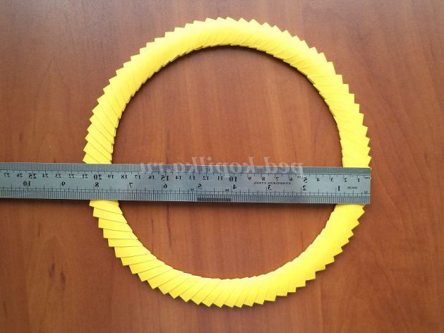 16. Виходить коло жовтої заготовки діаметром близько 23 см, тепер з'єднуємо модулі щільніше, надаючи правильний круг. Підсумок - діаметр 21см.