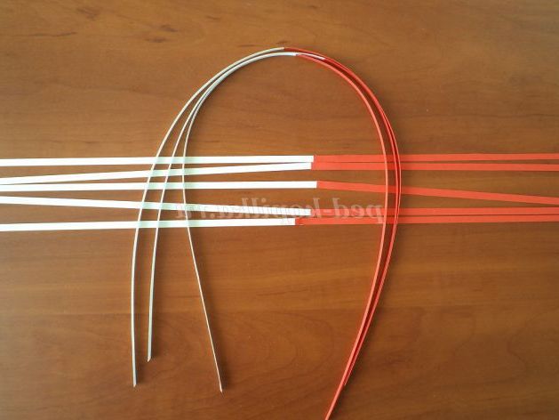 31. Для 1 червоно-білої квітки нарізаємо по 8 червоних і білих смуг шириною 5мм (можна і 3мм), довжиною 30 см. Склеюємо 1красную і 1 білу смужки.