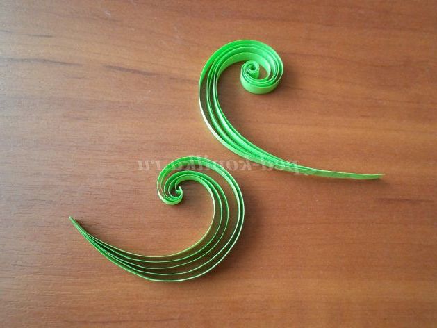 39. Зелені смужки - 5мм х 15см - 5шт. склеюємо з одного краю в стопочку. Трохи даємо підсохнути, і закручуємо на зубочистку до кінця. Розпускаємо, формуємо довжину смужок. Обрізаємо по короткій смужці, краю склеюємо. Краю верхньої завитки склеїла, щоб показати, як виходить. Нижня - підсумкова.