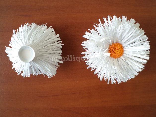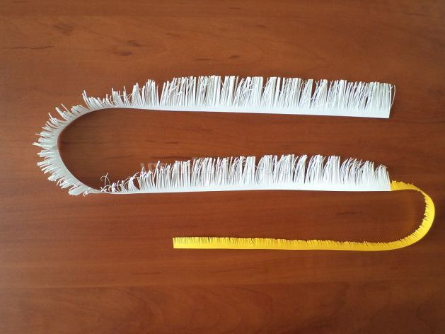 Для 1 ромашки нарізаємо білий офісний папір шириною 3 см, довжиною 30см - 2шт і 1 жовту смужку шириною 1,5 см і завдовжки 30 див. Нарізаємо бахромою зручним для Вас способом. Склеюємо між собою ці заготовки в довжину.