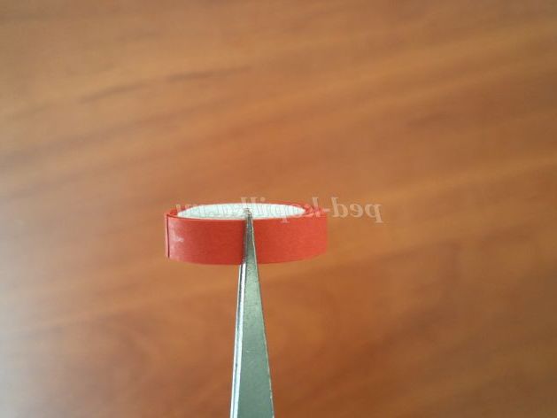 30. За допомогою інструменту для квілінгу скручуємо рол, починаючи з жовтої смужки. Кінчик підклеюємо. Перевертаємо квітку і трохи заливаємо його клеєм ПВА.