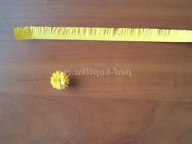 37. Для серединки готуємо смужку жовтого паперу р-р: 1см. х 30см. Нарізаємо бахрому. Ділимо навпіл. З половинки скручуємо рол.