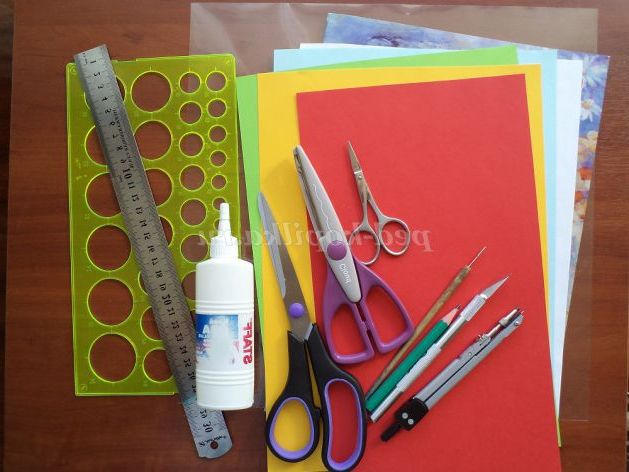 - офісний кольоровий папір формату А-4: по 5 аркушів жовтий і блакитний - для модулів, трохи яскраво - жовтою, червоною, зеленою, білою (довжиною 30 см);