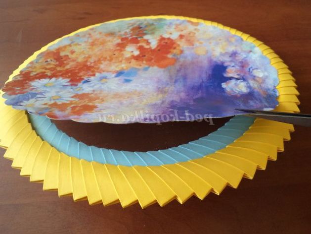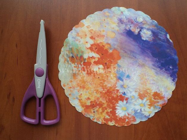 23. З картону вирізаємо коло діаметром 19 див. Можна вирізати фігурними ножицями. Я взяла картонну упаковку від акварельного паперу.
