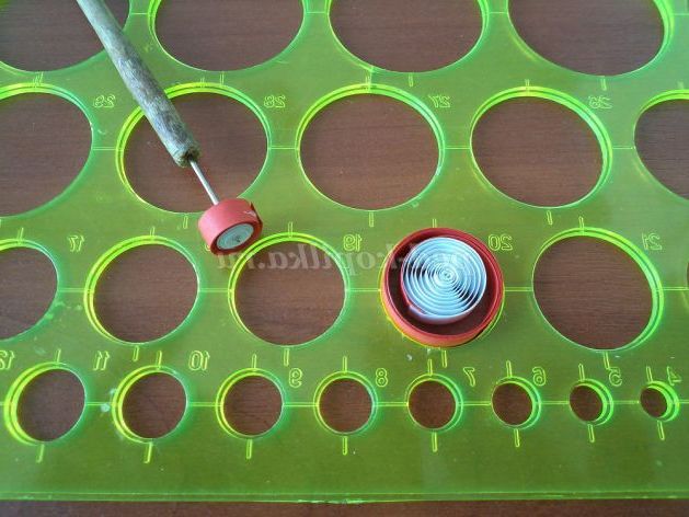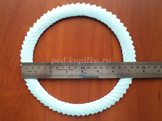 32. За допомогою інструменту для квілінгу скручуємо рол, починаючи з білої смуги. Розпускаємо рол за допомогою лінійки з окружностями до діаметра 20см.
