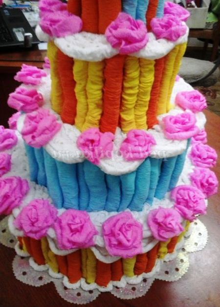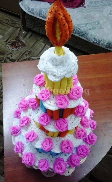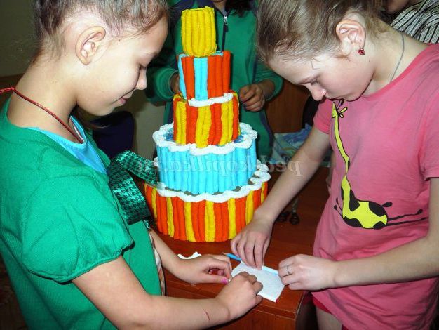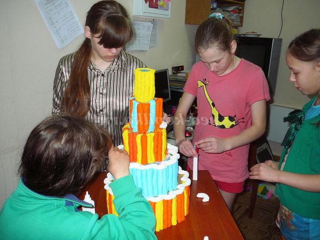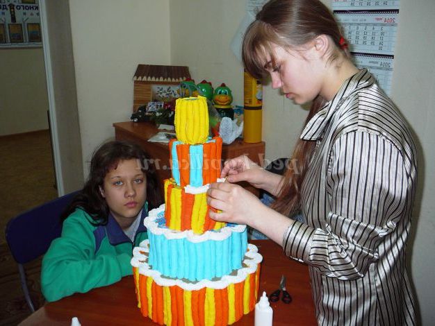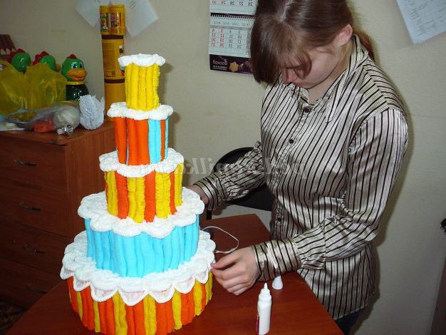 Взяли кольоровий гофрований папір, щільний картон, клей, ножиці, голки, скоби, степлер,дирокол та інші матеріали. З картону спорудили макет торта. Скручували гофровану папір за допомогою олівців і приклеїли її до макету. Дуже складно було створити легкість для білого крему, але у нас все вийшло. Виготовили троянди за такою ж технологією, приклеїли.