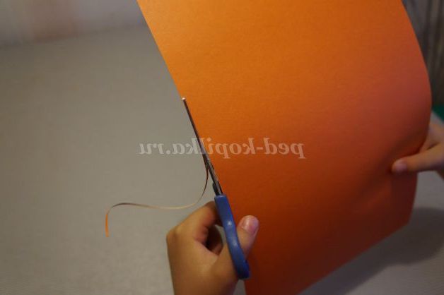 1. Візьмемо аркуш картону помаранчевого кольору і по всій довжині наріжемо тонку соломку. Чим тонше соломка, тим цікавіше буде з неї вінок.