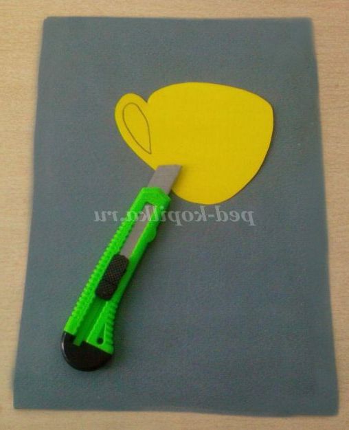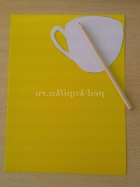 Шаблон чашки обводимо простим олівцем на жовтому картоні і вирізаємо.