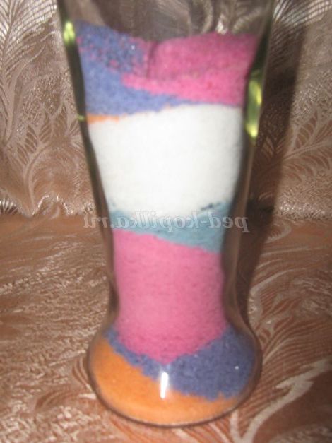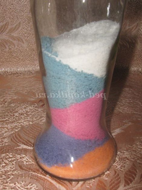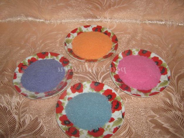 Щоб забарвити сіль гуашшю, її необхідно розмістити по судинах і додавати туди гуаш до тих пір, поки після розмішування сіль не стане рівномірно пофарбованої.