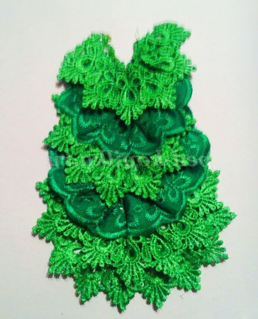 Бере ажурну тасьму зеленого кольору (довжина 20-25см) і також збираємо її у волан і приклеюємо.