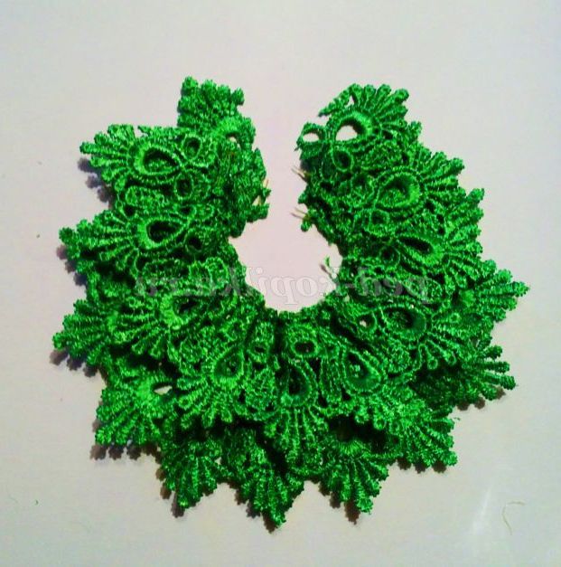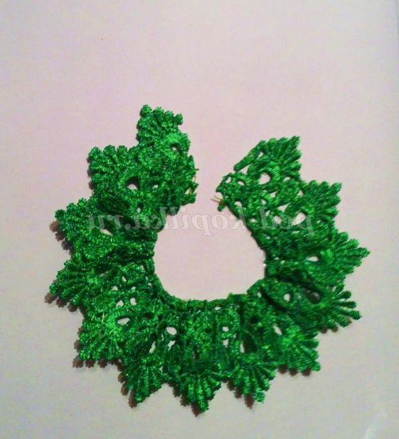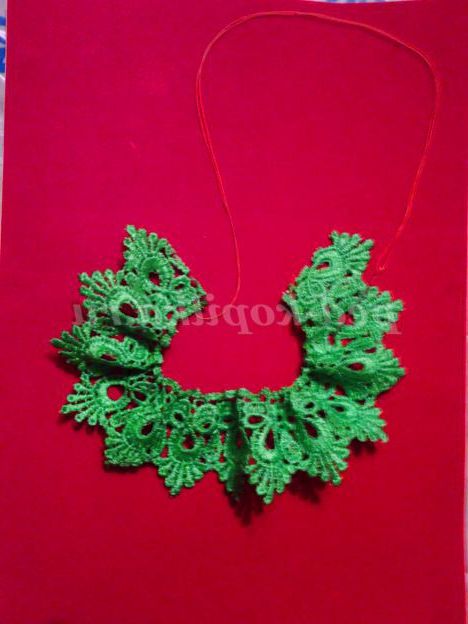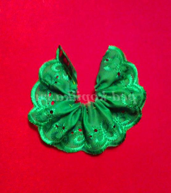 Беремо ажурну тасьму зеленого кольору (довжина 25-30 см) і нанизує на нитку, стягаємо нитку таким чином, щоб вийшов волан.