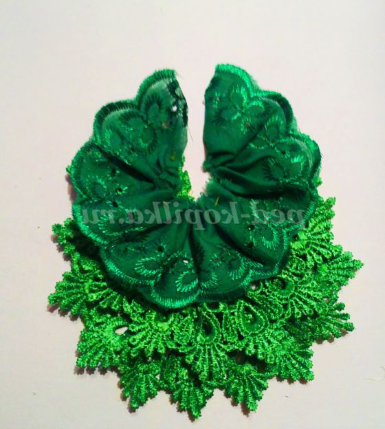 Беремо ажурну тасьму іншого відтінку зеленого кольору, збираємо її у волан.