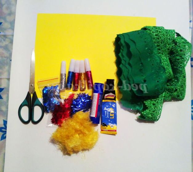 Необхідні матеріали: кольоровий папір (жовта), намистинки для прикраси, гель «Момент», клей-блискітки, ватман (1/2), ажурна тасьма зелена двох відтінків, зірочки для прикраси, синтетичний матеріал (жовтого кольору), клей-олівець, кольорові олівці, картон синього кольору.