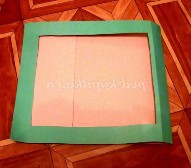 5. Нашим наступним етапом у роботі буде виготовлення рамки . Для цього беремо аркуш зеленого картону, складаємо його навпіл і на лицьовій стороні вирізаємо прямокутник, який за розміром буде відповідати нашій рамці з квасолі.