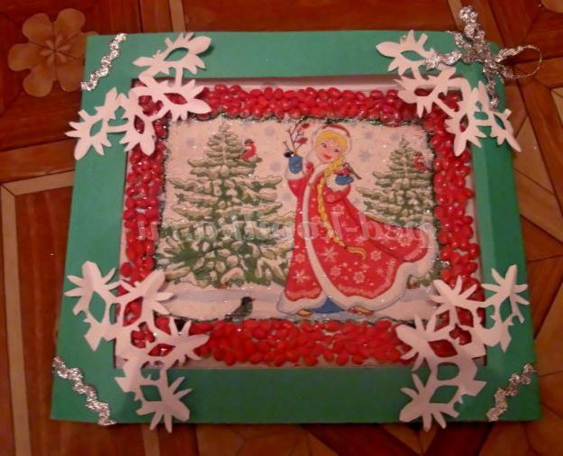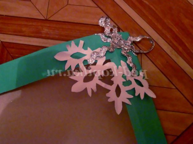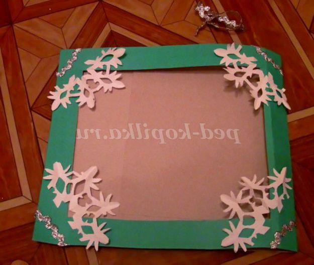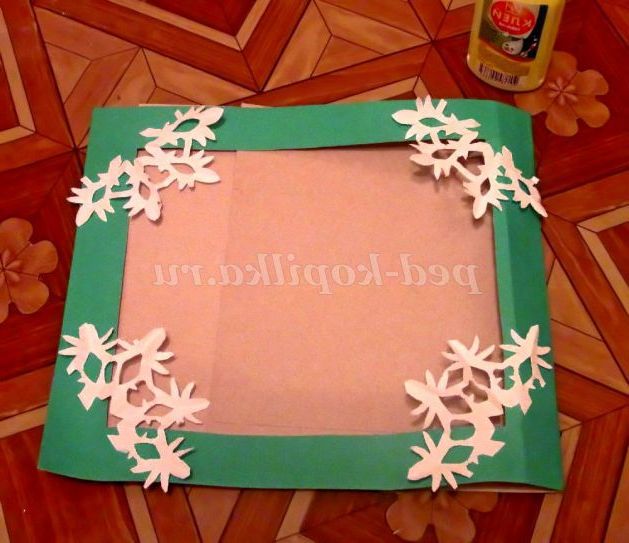 7. Отриманими половинками зі сніжинок ми декоруємо куточки рамочки. Закріплюємо сніжинки з допомогою клею ПВА.