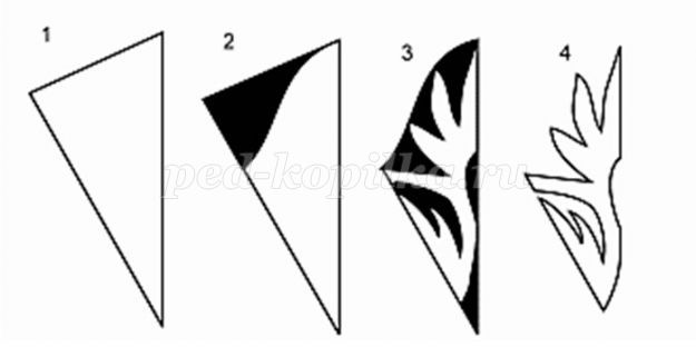 Для сніжинок нам знадобиться квадрат білого паперу шаблон, на якому нанесений малюнок. Квадрат ми складає по діагоналі 4 рази. На отриману основу наносимо малюнок візерунка для сніжинки.