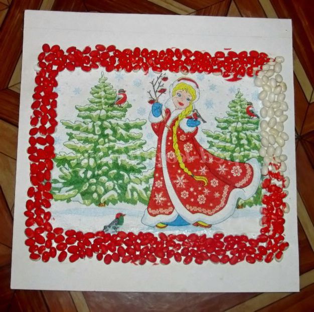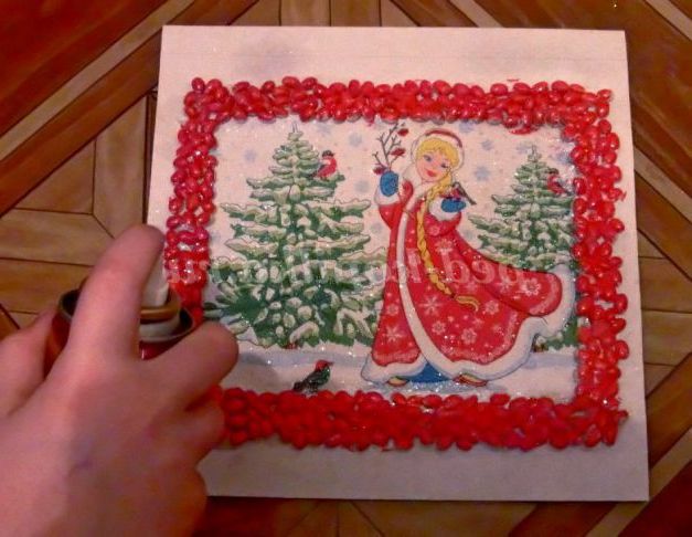 3. Рамку з квасолі ми розфарбовуємо гуашшю в червоний колір. Можна використовувати і інші кольори в залежності від кольорів використовується нами малюнка на серветці.