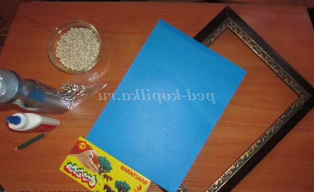 3. Тепер наносимо внизу аркуша синього картону клей ПВА, на нього викладаємо шар квасолі білого кольору. Це будуть морські камінці.