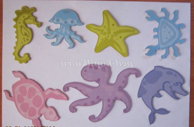 1. Беремо аркуш синього картону, наносимо туди зображення морських мешканців (для цього можна використовувати шаблони)