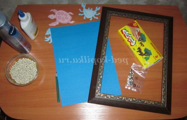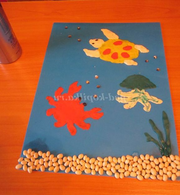 3. Тепер наносимо внизу аркуша синього картону клей ПВА, на нього викладаємо шар квасолі білого кольору. Це будуть морські камінці.