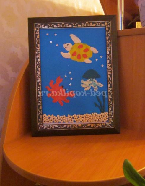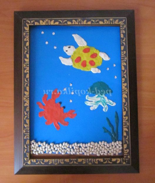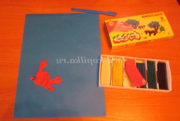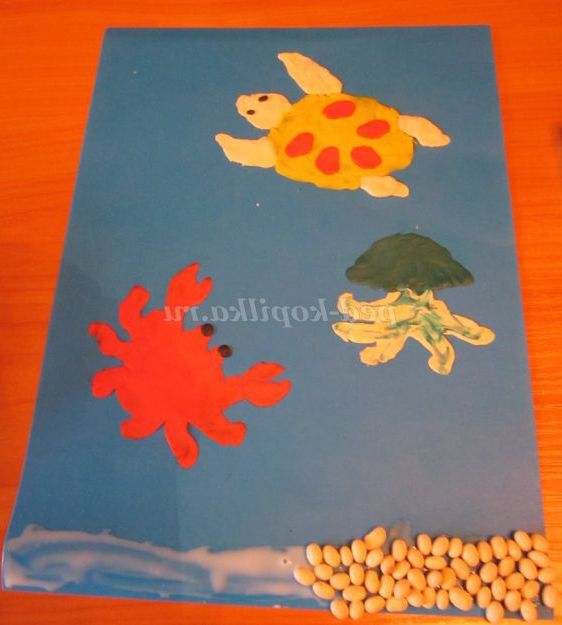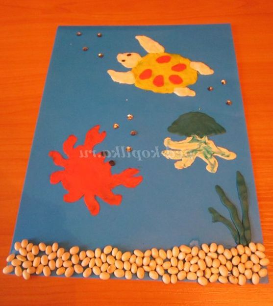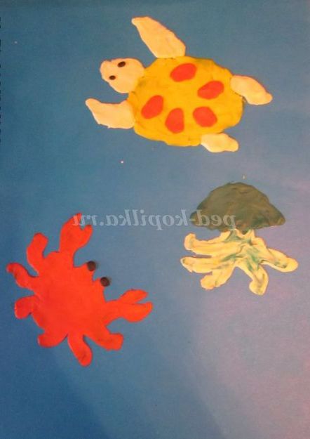 2. Для подальшого виконання роботи нам знадобиться пластилін. Не виходячи за контури зображення, розмазуємо маленькі шматочки пластиліну на зображеннях наших морських мешканців