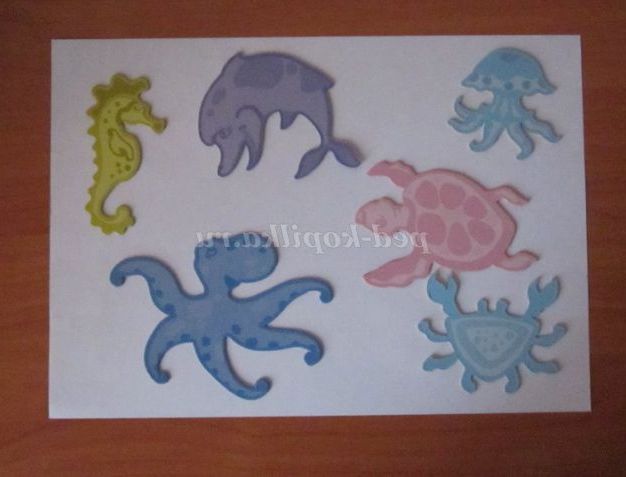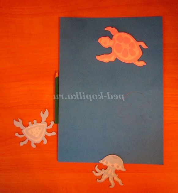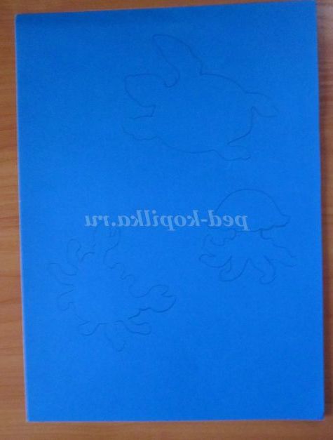 1. Беремо аркуш синього картону, наносимо туди зображення морських мешканців (для цього можна використовувати шаблони)