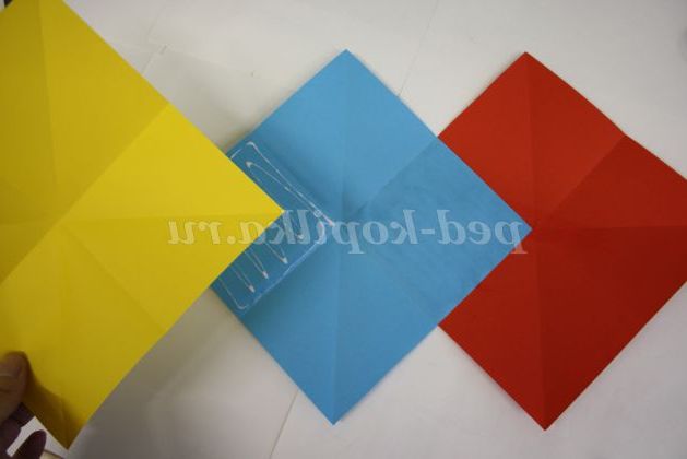 1) З тонованою папери нам необхідно скласти і обрізати 3 квадрата. Скласти їх по діагоналі навпіл і так, як показано на рисунку.