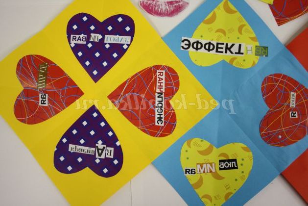 5) Вирізаємо з журналу потрібні літери, складаємо з них слова і приклеюємо на сердечка.