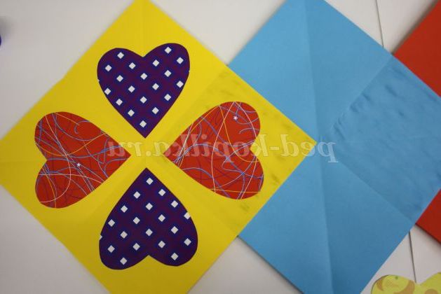 2) Приклеюємо 1/4 частина блакитного квадрата на червоний клеєм ПВА. Потім 1/4 частина жовтого квадрата на блакитний. І кладемо під прес.