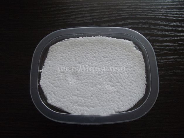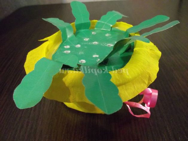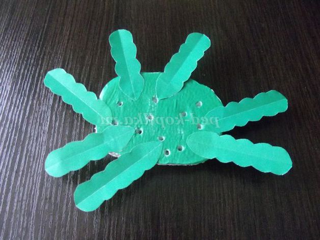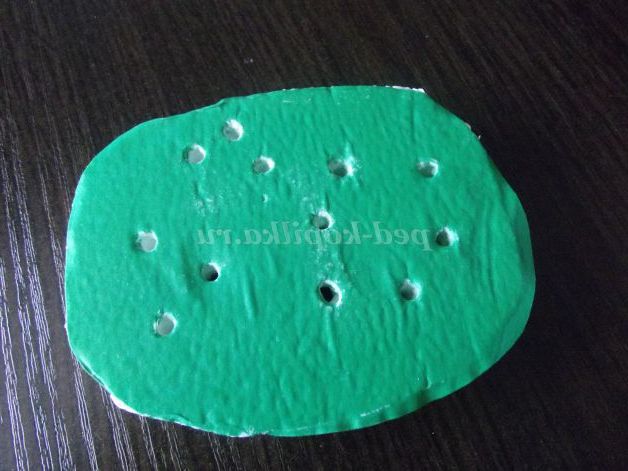 6. Пінопласт вирізати за формою контейнера і обклеїти зеленим папером, після просихання зробити отвори за кількістю зроблених квітів.