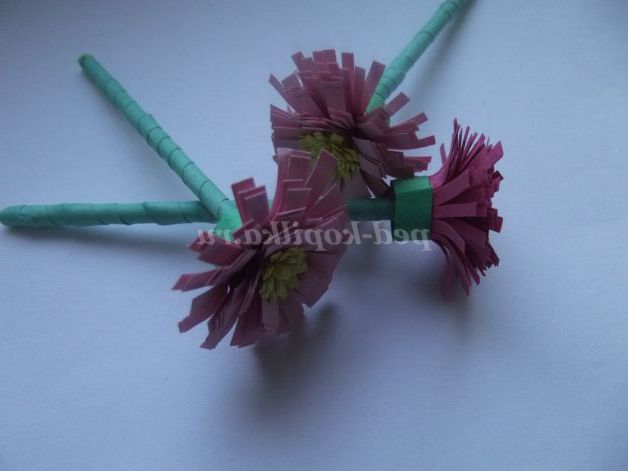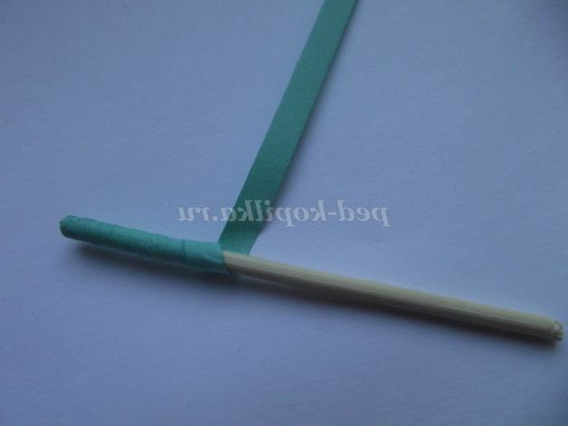 5. Щоб зробити стебла, паличку довжиною 5 - 6 см обмотати зеленою смужкою, змазані клеєм і вставити в середину бутона.