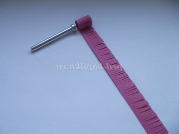 1. Спочатку будемо робити квіти. Смужку рожевого кольору, часто надрізати на 2/3 ширини.