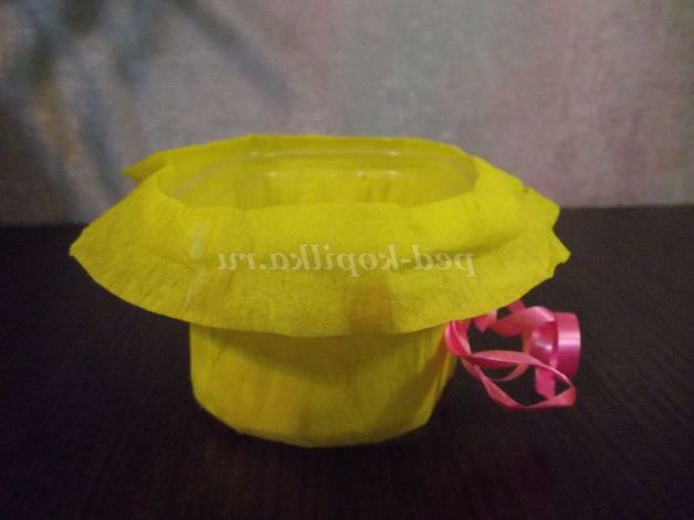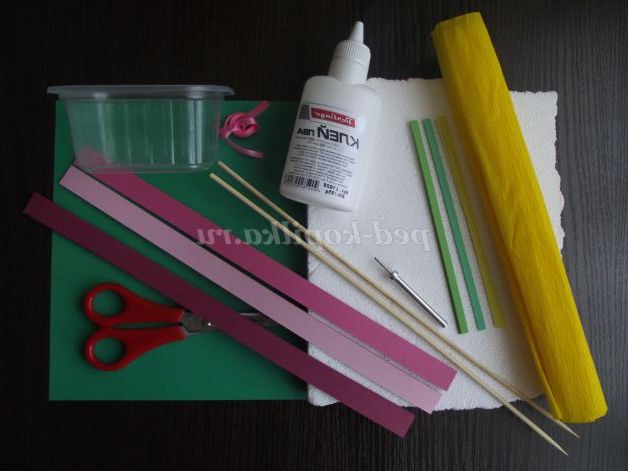 Обладнання: смужки для квілінгу рожевого кольору шириною 1,5 див, жовтого, зеленого - 0,5 див.; клей ПВА; ножиці; інструмент для скручування; лист зеленого паперу; тонкі дерев'яні палички; одноразовий контейнер невеликого розміру; пінопласт; жовта гофрований папір; вузенька стрічка.