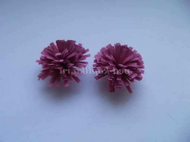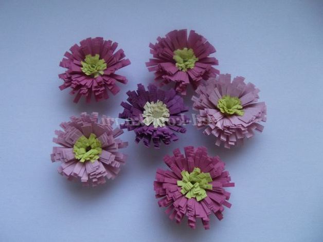 2. Щільно закрутити смужки в гуртки, заклеїти кінці, потім розпушити квіти і бутони, відгинаючи надрізані пелюстки.