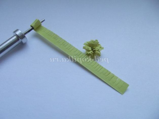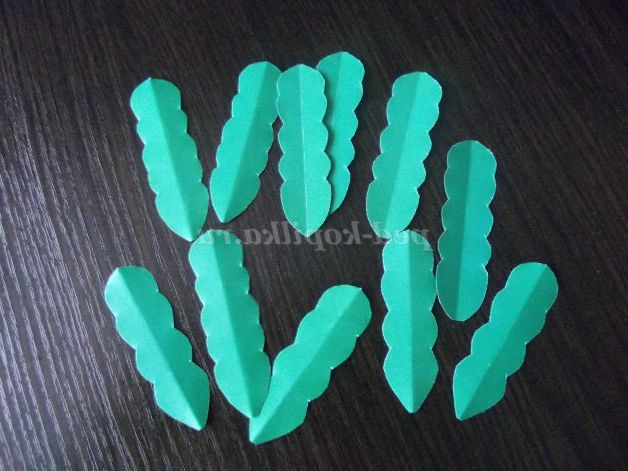 7. Зелену папір загнути уздовж краю на 0,7 см і вирізати листя різної конфігурації,