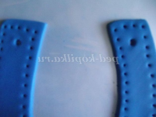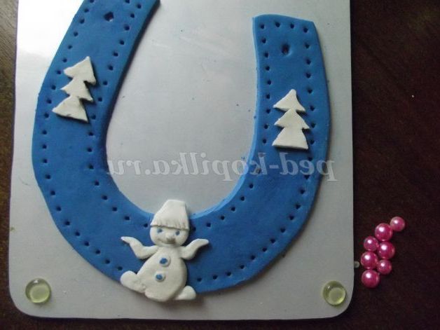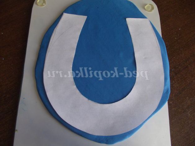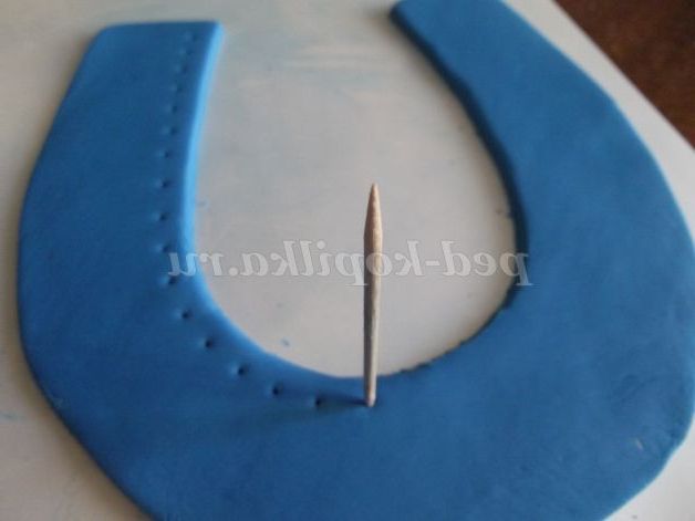 На дощечці для ліплення розкачуємо масу синього кольору, щоб товщина предмета вийшла 0,5 см і вирізаємо за допомогою стеки форму підкови за заздалегідь підготовленим трафаретом.