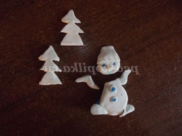 Розкочуємо тонко білий шматочок і за допомогою стеки вирізаємо ялинки і детальки снеговика.Дадим їм підсохнути.