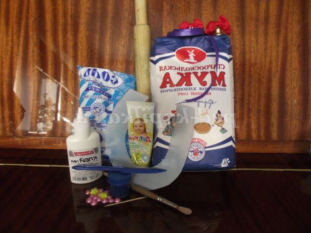 Борошно 100 гр.; сіль «Екстра» 50 гр.; вода 70 мл (кількість води залежить від виду борошна); дитячий крем; гуашева фарба синього кольору; заготівля з паперу - підкова; зубочистка; стека; дошка для ліплення; стрічка (довжина по вашому бажанню); декоративні прикраси: зірочки, намистинки, дзвіночки.