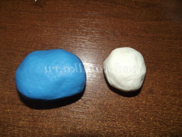 Всю масу ретельно вимішуємо, щоб вона вийшла м'яка і еластична при цьому руки потрібно рясно змастити дитячим кремом. Потім розділимо отриманий ком на 2 нерівні частини.