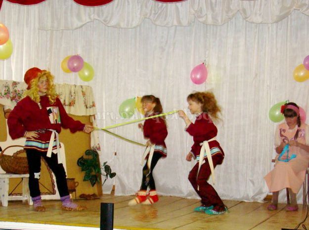 - Домовята, допоможіть виправити мою помилку, давайте допоможемо Настусі вузлики розплутати. Один поясок одному, другий - другого. Хто швидше розв'яже вузлики, той і виграє.