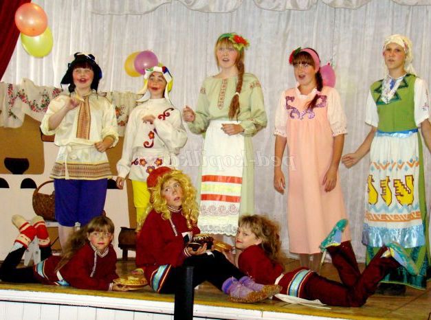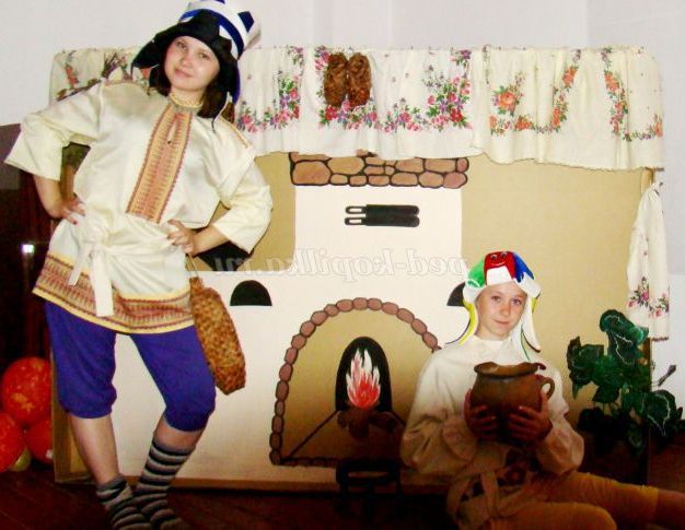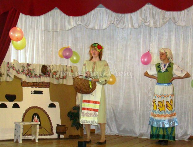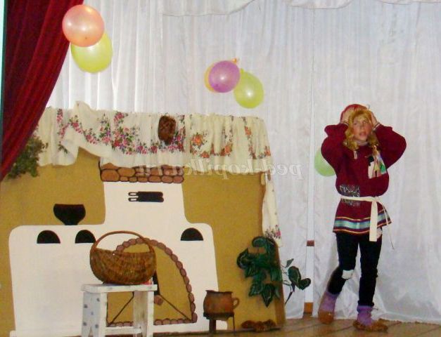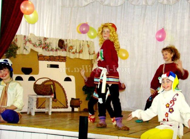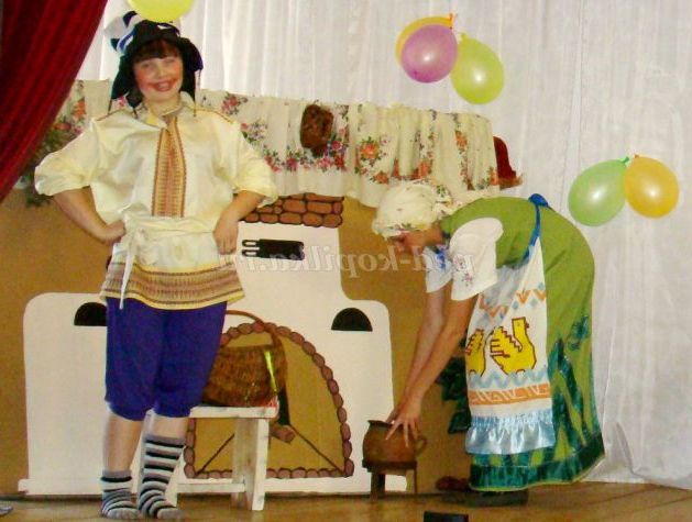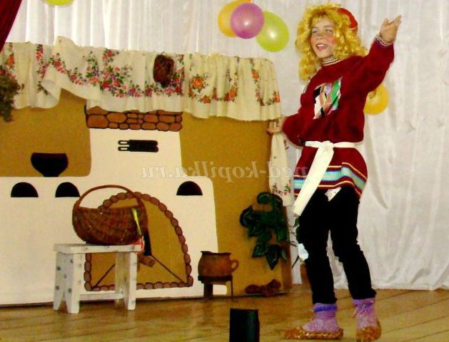 Сцена оформлена у вигляді селянської хати. В кутку - макет російської грубки, лавка, біля неї дерев'яна лопата і рогач. Поруч стоїть дерев'яний стіл. На ньому самовар, дерев'яні та глиняні кухлі.