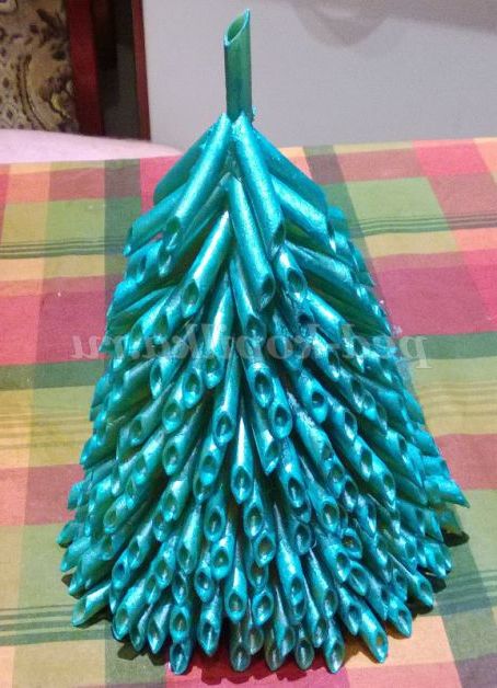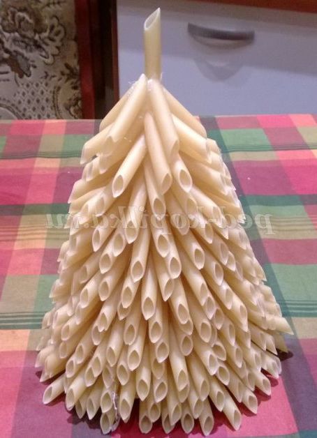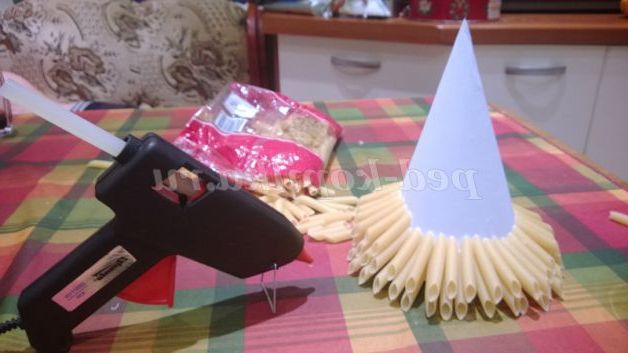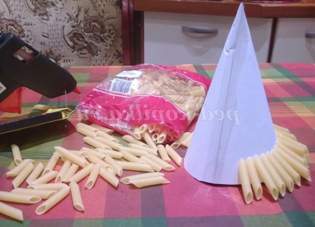 Так обклеювали макаронами весь конус. Зверху поставила шпиль.