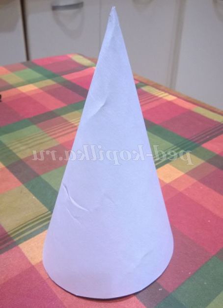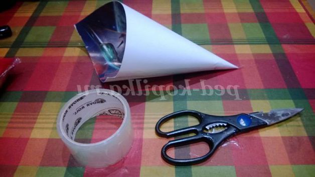 Картон А4 (будь-якого кольору, в даному випадку обкладинка від альбому для малювання) я склала у вигляді конуса і склеїла скотчем.