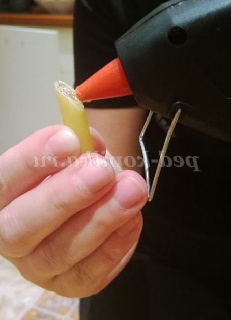 Відразу після промазування приклеювала макаронину до конусу - основи. Робити це потрібно швидко, так як клей мнгновенно застигає.