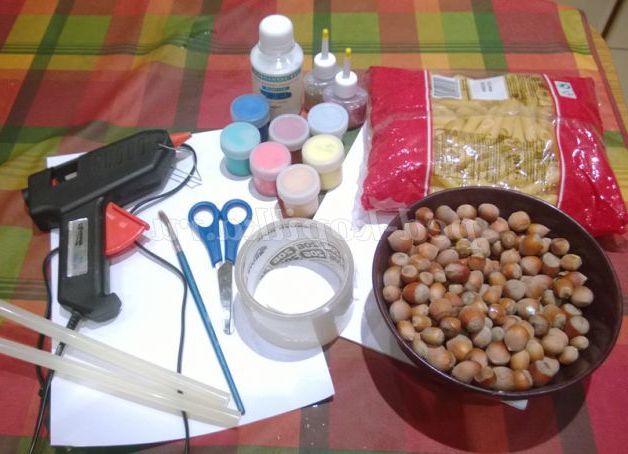 Склеїла термопістолетом зірку з пофарбованих горіхів.